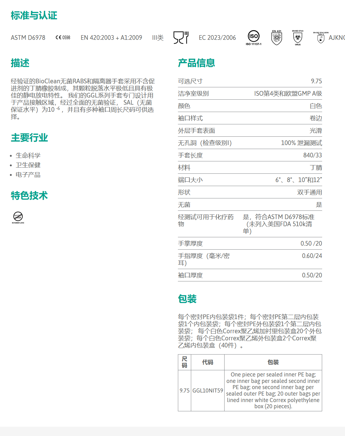检测合格的灭菌丁睛橡胶RABS/隔离器手套适用于ISO Class 4 & EU GMP Grade A洁净灭菌区域
