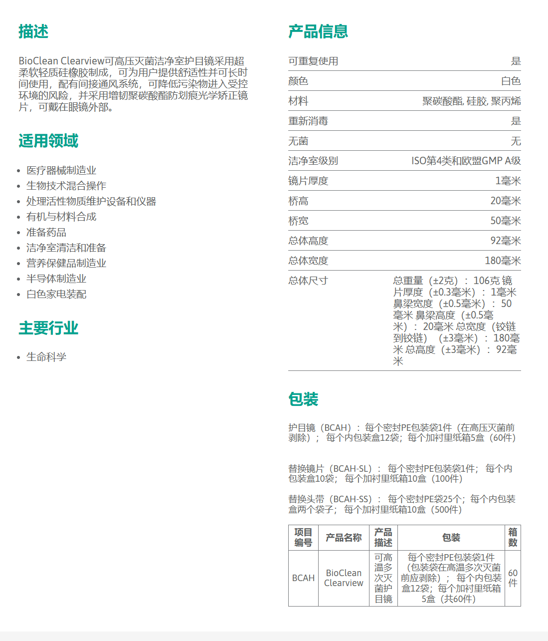 可高温多次灭菌护目镜适用于ISO Class 4 & EU GMP Grade A洁净灭菌区域